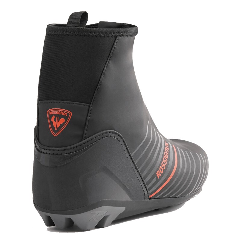 Den klassiske konstruktion er udstyret med forstærket hælkappe, som sikrer stabil og ensartet støtte gennem hele afsættet. En integreret overdel med central lynlås holder sne og fugt ude, så du kan fokusere på teknikken.